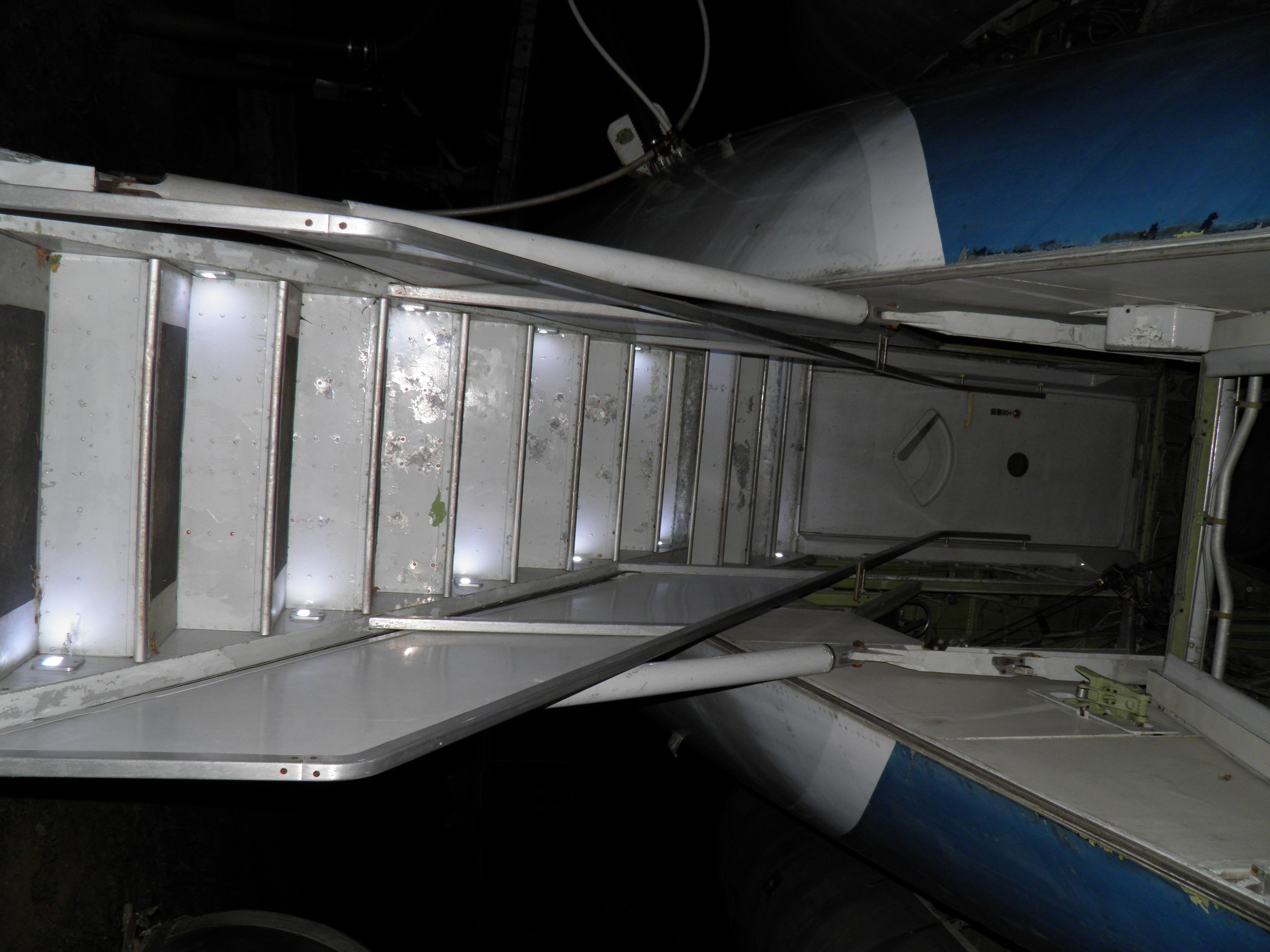 Exterior work included fabrication of a simple structure rendered from surplus computer room floor tiles which provides stair like access to the top of the right wing tip. The same tiles were also used to fabricate a simple porch over the turf the air stairs rest upon when extended, plus an elongated landing surface for the aft drain mast which disperses the gray water which exits that mast so no soil erosion occurs. In addition to functional benefits, these simple improvements significantly enhanced the visual appeal of the grounds.