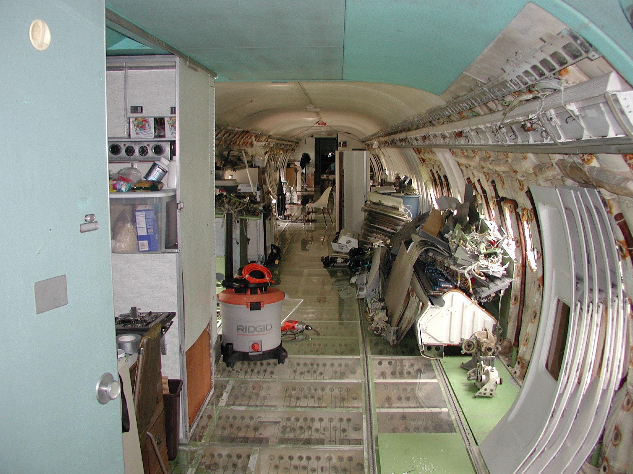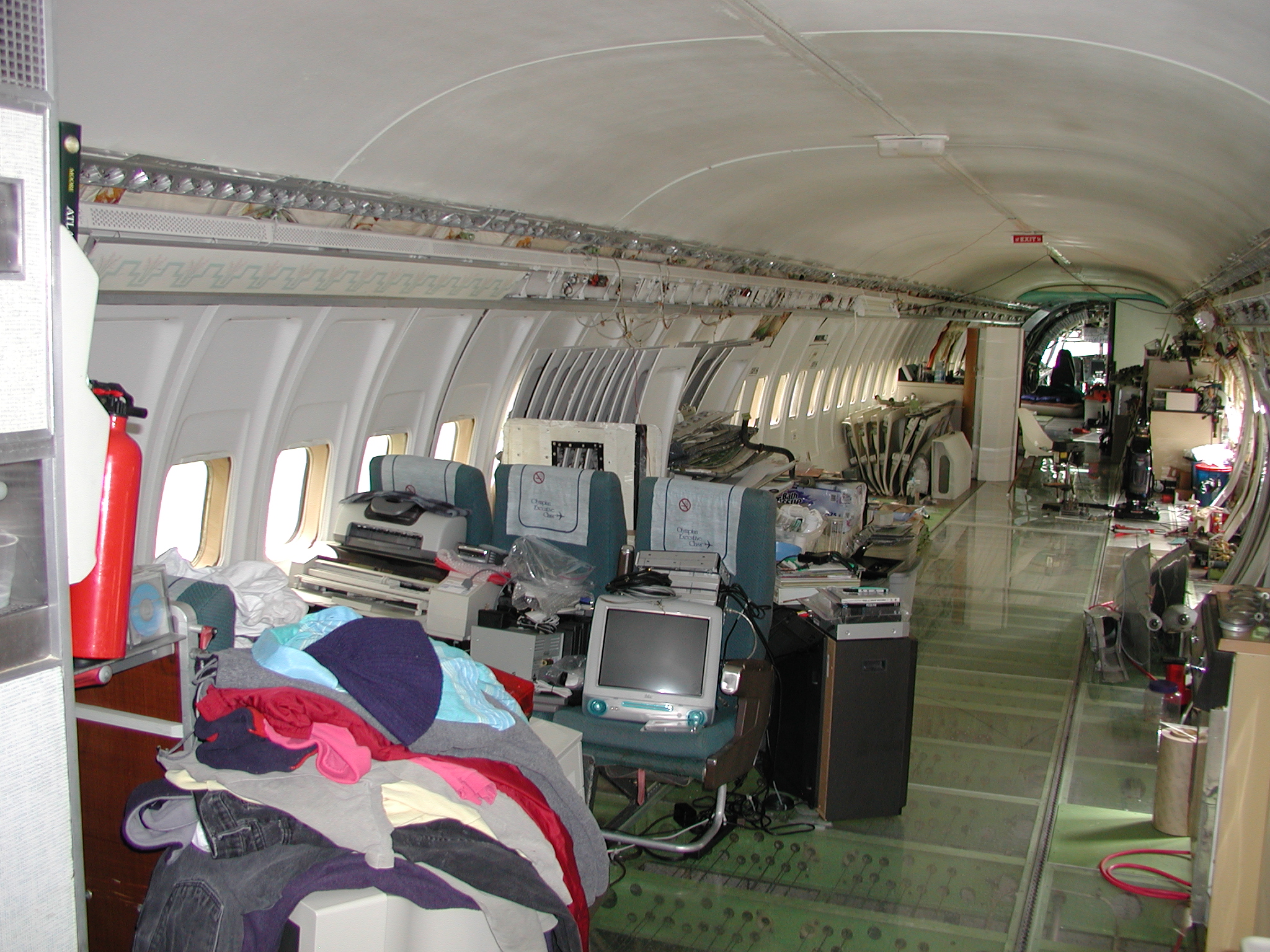 The clutter that overwhelms the cabin is the result of pressure washing the last of the components acquired from the Lake City Florida 727 freighter during December 2004 to January 2005, plus a lot of pressure washed personal domestic possessions that I've moved out of the disgusting old mobile home, before the mice and mold render them unrecoverable even by my substantial pressure washer. This is no small task - I've accumulated more artifacts over the years than I can reasonably manage (yet less than I need it sometimes seems), and any that have been in the mobile home have to be thoroughly cleaned before I'll allow them in the aircraft. For electronics, including TVs, stereos, computers, work related instruments, and similar items, this means disassembling them, pressure washing the individual sections, moving them into the very dry cabin (due to frequent operation of an air dehydrator), then reassembling and testing them once thoroughly dry. It's a lot of work, but it fully restores them to showroom condition (in terms of cleanliness), and thus makes them compatible with the aircraft. Frankly, it's either that or discard them - the mobile home is that badly degraded (it's genuinely disgusting). Most items will simply sit in the aircraft for later use, although some serve to inform or entertain me during work breaks or as background to work. This effort is ongoing - I'm trying to complete as much pressure washing as possible before the weather degrades, and hope to essentially finish it by winter, reducing the mobile home to the barest of basics (and cheapest, since remaining items may be unrecoverable later).
