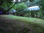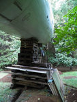 Most though not quite all of the pressure washing is complete but the front landing gear support structure remains incomplete (no rebar has been fabricated and no concrete poured, a disappointment), and my west storage van, though now thoroughly clean, was moved only a modest portion of the distance to its final destination. But all the ugly material in my forest south of my right wing was fully relocated and my wind generator is substantially (though not completely) installed (currently it's temporarily connected only to my right outboard landing light).