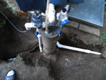 The steel well casing is badly corroded below natural ground level as you can see. I don't yet know whether this severity of corrosion extends further down where the protective concrete jacket seems generally intact - I'll investigate by chipping a bit of the concrete away so I can inspect the underlying steel. If the concrete protected steel has minimal corrosion I'll try to remove the corrosion above the concrete level, add a protective coating, then pour new concrete to extend the concrete jacket well above ground level. But this work won't occur until spring or summer 2018 at the earliest.